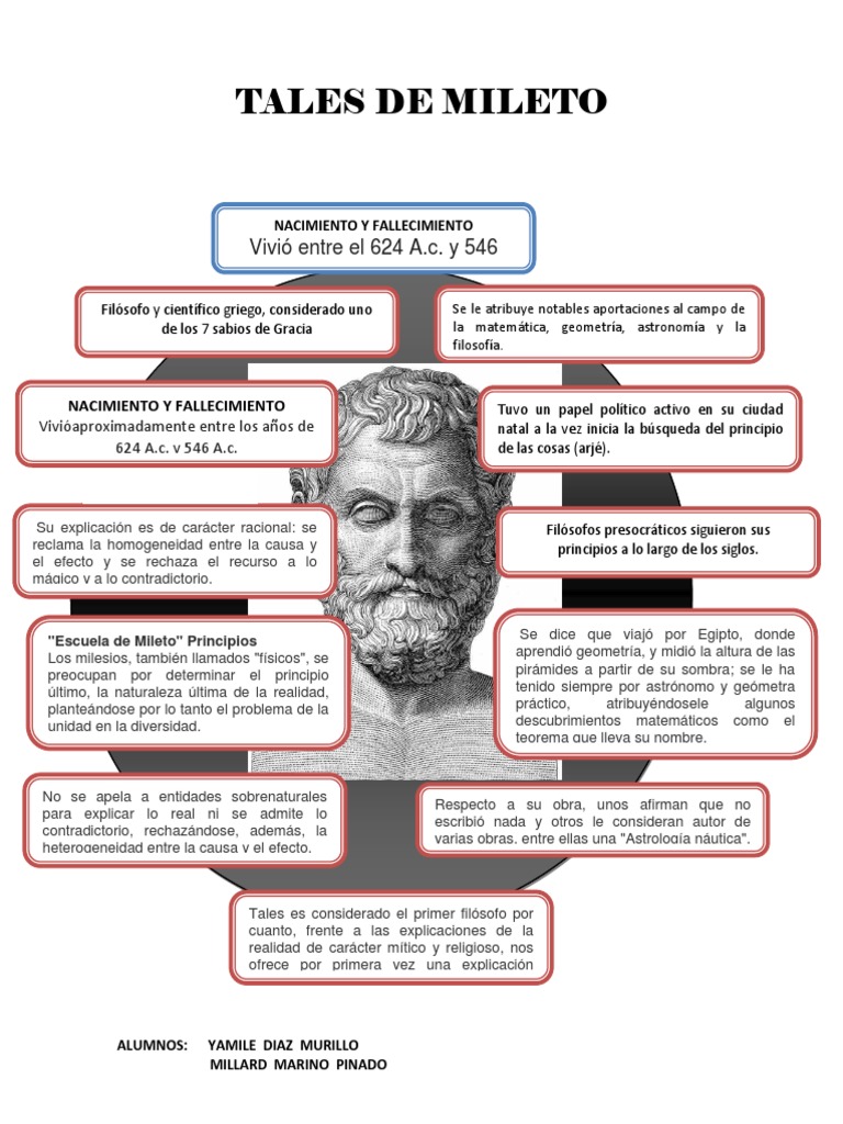 Quien fue tales de mileto resumen. Es recordado principalmente por su cosmologa basada en el agua como esencia de toda la materia con la tierra un disco plano flotando en un vasto mar. No se tiene informacin sobre sus escritos y su vida se conoce fraccionadamente por las referencias de otros autores. Se le llam Tales de Mileto o Thales porque vivi en la ciudad de Mileto entre 624 aC.